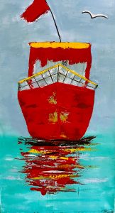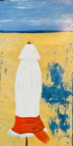 Die Arbeiten leben von kräftigen Tönen, nicht immer klaren Formen und dem Blick, der die Dinge nicht größer macht, als sie sind. Himmel, Wasser und Strand, Menschen und Gegenstände dürfen schief geraten sein oder sich farblich danebenbenehmen. Das ist Absicht. Acryl als Medium passt dazu – direkt, unkompliziert und nicht nachtragend, wenn etwas danebenläuft.